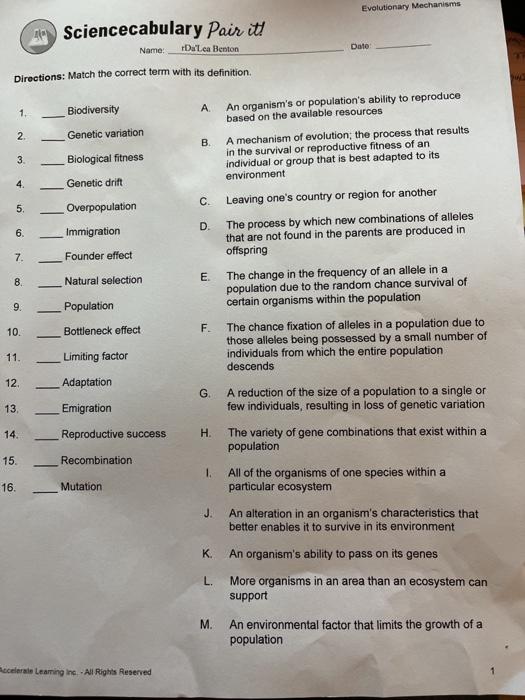 Solved Evolutionary Mechanisms Sciencecabulary Pair It Chegg Com